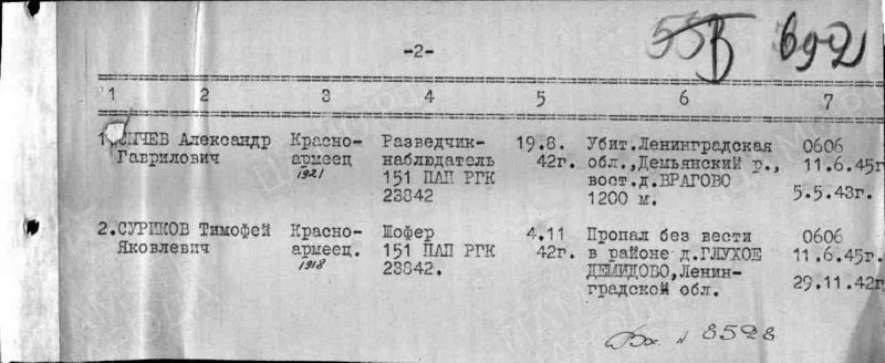 Посвящается светлой памяти моего родного деда, воина-красноармейца Сурикова Тимофея Яковлевича (годы жизни: 1918-1999г.г.), уроженца д. Прилогино Рядовой Суриков Тимофей Яковлевич, красноармеец, шофер 151-го артиллерийского Ленинградского полка 53-й Армии. В годы войны, мужественно и героически воевал в составе Северо-Западного фронта на стратегически важном направлении, в районе Демянска Ленинградской области (ныне Новгородской области, 250 км южнее Ленинграда) против 16-й немецкой армии, состоявшей из отборных сил дивизии СС ,,Тотенкопф"- ,,Мертвая голова", гитлеровской армии группы ,,Север". В феврале 1942г. вокруг 16-й немецкой армии под Демянском замкнулось первое в истории Великой Отечественной войны окружение крупных сил противника. В кольце оказалась большая часть сил 16-й фашистской армии (до семи дивизий), образовался так называемый ,,Демянский котел". Но в апреле 1942г., немцам все-таки удалось в районе д. Рамушево пробить и удерживать за собой узкий коридор в 6-8 км., который составлял логистический путь войскам ,,Третьего Рейха". Впоследствии в ,,Рамушевском коридоре" шли страшнейшие бои. Немцы его называли ,,Маленьким Верденем", а наши ,,Коридором смерти"... Советские войска стремились захлопнуть прорыв и ликвидировать коридор, а фашисты, наоборот, пытались его расширить. Удержание Демянского выступа и спасение группировки сыграло в дальнейшем с Гитлером злую шутку. Он считал, что немецкие войска смогут выдержать любое окружение и удержать за собой занимаемые позиции. Осенью 1942г. он запретит Паулюсу покинуть Сталинград, пока это было возможно, пока у дивизии были еще силы вырваться из окружения. Советским войскам данная операция позволила набраться опыта, который они применят под Сталинградом. Потери за ,,Рамушевский коридор" были с обеих сторон огромными: у немцев - более 90 000 человек, с нашей стороны - более 120 000 человек. В затишьи между боями дед вспоминал свой дом, отца, мать и своих братьев, мал мала меньше, что давало ему надежды вернуться домой живым. Он был старшим сыном, в многодетной семье Суриковых. Его родной брат, Василий (1924 г.р.), также как и он, фронтовым шофером, защищал Родину от фашистских захватчиков. В ноябре 1942г., при взятии хорошо укрепленного фашистского плацдарма, рядовой шофер Суриков Т.Я. в одном из боев, был тяжело ранен осколочно-фугасным, в районе д. Глухое-Демидово Демянского района, где шли кровопролитные бои за нашу Советскую Родину. Войска СС ,,Тотенкопф" - ,,Мертвая голова", составляющие костяк и боевой дух 16-й немецкой армии, словно пожарная команда, носилась туда-сюда вдоль и поперек ,,Рамушевского коридора", бесконечно заслоняя собою бреши от ударов Красной армии. От полученного тяжелого ранения Сурикова Т.Я. контузило, он потерял сознание и много крови... . В суете и неразберихе военного времени его внесли в списки безвозвратных потерь 53-й Армии, какое-то время он считался без вести пропавшим.... После лечения и реабилитации дед продолжил защищать нашу Советскую Родину от немецкой нечестии. Награжден орденом ,,Отечественной войны" 2-й степени, медалью ,,Жукова", ,,За победу над Германией в годы Великой Отечественной войны 1941-1945г.г." В 1943г. по инвалидности был комиссован, вернувшись в родное Прилогино Тимофей Яковлевич, продолжал ударно трудиться на благо фронта и победы, строил мирную жизнь и работал в сфере сельского х