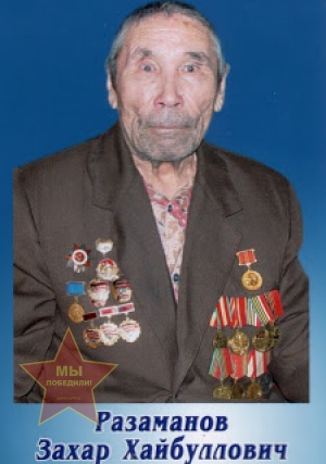 Моего прадедушку зовут Разаманов Захар. Он родился 6 мая 1926 года, а в армию его призвали в 1944году, там он закончил школу снайперов и был направлен в сержантскую школу, а уже потом ушёл на фронт ефрейтором, снайпером 36 (или 136) стрелкового полка, 38 стрелковой дивизии. Победу мой прадед встретил на станции Бугуруслан , которая находится в Оренбургской области .Но война для прадедушки , не была закончена, его послали на Дальний восток на войну с Японией, с войны он вернулся в 1952 году и был Награжден орденом Отечественной войны, медалью «За победу», юбилейными медалями.