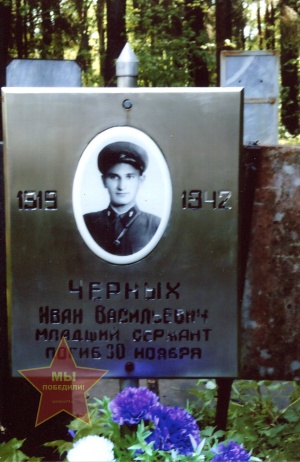 Брат моего отца Иван Васильевич Черных воевал с врагом лицом к лицу. На фронт он ушёл танкистом в начале войны. В 1941 году ему исполнился 21 год. Он участвовал в боях во время обороны Москвы. Тогда погибло много людей. Вражеский снаряд попал в танк, в котором он был. Никто из экипажа не выжил. Его маме, которая жила в Тамбовской области, в селе Заворонежское, пришла выписка из приказа Западного фронта о награждении личного состава № 077 от 22 января 1943 года. Действующая Красная Армия «от имени Президиума Верховного Совета Союза ССР за образцовое выполнение боевых заданий командования на фронте борьбы с немецкими захватчиками и проявленные при этом доблесть и мужество награждает орденом Отечественной войны 2 степени красноармейца Черных Ивана Васильевича, радиотелеграфиста старшего танка КВ-1 танкового батальона 32-Т Бр». И подписи: командующие войсками /Конев / Булганин/. Ещё она получила извещение (похоронку), где извещалось, что он погиб в бою за Родину, верный воинской присяге, проявив геройство и мужество при исполнении боевого задания. Было указано точное место захоронения с отданием воинских почестей. В настоящее время это воинское кладбище в городе Зубцово на Московской горке. В День Победы наши родственники, живущие в Москве, приезжают сюда.