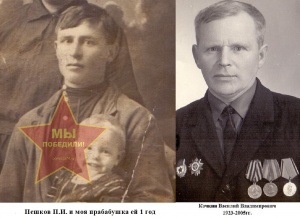 Моя прабабушка Кочкина Ольга Павловна 1931г.р. рассказала мне, что её отец ушел на фронт в 1941г. когда началась Великая Отечественная война. Звали его Пешков Павел Иванович 1910г.р. До войны он работал машинистом на железной дороге. На фронт его забирали из г. Челябинска и даже остановили поезд на одну минуту на станции Полетаево чтобы он попрощался с семьей. Служил прадед в звании ефрейтора 52 стрелкового полка 176 стрелковой дивизии. Он прошел всю войну, писал домой письма. Но к сожалению они не сохранились. Он был связистом, получил медаль «За отвагу». За то что 25 января 1945 года при прорыве долговременной обороны противника в районе Мазурских озер, когда прервалась связь между 63 стрелковым полком и 176 стрелковой дивизией связист Пешков, рискуя жизнью, выбежал на линию под разрывы снарядов и быстро восстановил на своем участке разрушенную связь и обеспечил командованию управление боем. Но прадедушку тяжело ранили. К сожалению 20 февраля 1945г. он умер от ран. Похоронен он в Восточной Пруссии близ г. Центен. Похоронка жене и детям пришла за несколько дней до победы. Прабабушка говорила их в семье было трое детей. В войну моя прабабушка, ее мама и средняя сестра голодали, хлеба давали мало 150 грамм на человека, ели мороженую и гнилую картошку, крапиву. А младшая была младенцем и кормить ее было нечем, она умерла от голода. Но война закончилась и нужно было жить дальше. В 1952г. прабабушка встретила прадедушку Кочкина Василия Владимировича, который тоже воевал. Кочкин В.В. родился в 1924 году весной, точную дату мы не знаем и он не знал, а единственная сестра которая осталась в живых не помнила. Родился он в большой семье, их было шесть детей, а он самый младший. В 30-е годы семью раскулачили за то, что у них была корова. В это же время в шахте случился обвал и маму с папой придавило. Дети, оставшиеся без родителей, стали умирать от голода. В живых остался мой прадед и его сестра. Когда началась Великая Отечественная война он хотел устроиться на Тракторный завод в городе Челябинске, но ему не было 18 лет, тогда он пошел на хитрость и сказал, что родился 10 сентября 1923года. Ему сделали документы, вот так он стал на полгода старше. Ушел на фронт в 1943 году и служил в 62 гвардейском саперном батальоне сапером. 30 июня 1944 года выполняя приказ командования о постройке моста через реку Березина проявил мужество и отвагу. Под массированным авианалетом бомбардировщиков противника не приостановил работы и выстроил мост на 3 часа раньше срока за что был представлен к награде «Орден Отечественной войны II степени». Участвовал в форсировании Днепра, где был контужен. Он вначале минировал поля, чтобы враг не прошел на нашу территорию, а потом разминировал, чтобы наши разведчики могли попасть в тыл врага. В очередном бою его засыпало землей от взрыва снаряда и оглушило ударной волной. Прадедушкин товарищ вернулся за ним, долго искал и откапывал его. Вот так прадед попал в госпиталь, откуда через неделю бежал на фронт. Дошел до Берлина. Затем был направлен в Японию. Вернулся домой в 1948г. с орденом, гвардейским значком и медалями за победу над Германией и Японией. Умер мой прадед 28 сентября 2005года за год до моего рождения. Моя прабабушка жива, в июле ей исполнится 84 года.