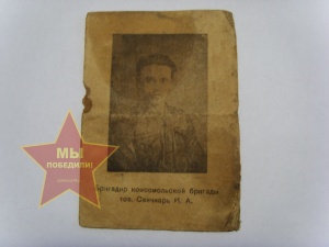 Был суровый год войны-1942 год, когда четырнадцатилетний Ваня Свичкарь непосредственно со школьной скамьи ремесленного училища вступил в ряды героических бойцов тыла на Кировском заводе (Челябинский тракторный завод), выпускающем грозные боевые машины для Красной Армии. Ещё в раннем детстве Ваню привлекала механика, любовь к которой усердно прививал ему его отец – железнодорожный мастер. Со смертью отца на плечи Вани легла забота о матери, и он с увлечением и страстью отдаётся любимому делу. Свою работу на заводе тов. Свичкарь начал учеником на участке обработки тормозных колодок в цехе, где начальник тов. Довжик. Смышленому ученику вскоре было поручено обслуживание зубофрезерного станка. Освоив станок тов. Свичкарь обратился к мастеру с просьбой дать ему дополнительную работу. Ему поручили клеймение деталей и связывание их в узлы проволокой. Тов. Свичкарь с успехом выполняет эту работу, наряду со своим основным заданием по обслуживанию станка. Молодым оператором владеет, однако, большая любознательность. Вскоре он знакомится с работой на всех станках своего участка – зубофрезерных, токарно-карусельных и сверлильных. Подробно и внимательно изучает он технологический процесс изготовления обрабатываемых на них деталей. Уже через год Иван Свичкарь становится во главе фронтовой молодёжно-комсомольской бригады. В соревновании по заводу бригада тов. Свичкаря завоевала одно из первых мест. Она систематически удерживает первенство в соревновании по цеху. На заводе широко развернулось агарковское движение. На одном из производственных совещаний, посвящённому обсуждению агарковских методов работы, тов. Свичкарь сказал: «Мы должны добиться того, чтобы нас не задерживали операции смежников. Нужно во что бы ни стало обеспечить полную загрузку на наших собственных операциях». Здесь же на совещании был обсуждён и принят предложенный тов. Свичкарь план перестройки работы участка. Новый способ организации производства на участке позволил, при меньшем расходе рабочей силы, выполнять и перевыполнять производственные задания. Дружная и плодотворная работа фронтовой комсомольской бригады тов. Свичкаря служит образцом для всех рабочих цеха. Члены бригады: сверловщица – комсомолка Надя Ломбас, токари и фрезеровщики Салиман Хакимов, Алтухов, Бессуднов, Ларионова.1943 год.